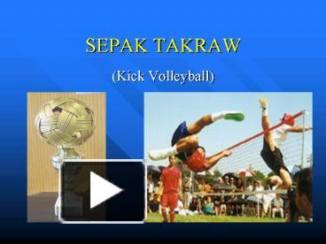SEPAK TAKRAW (Kick Volleyball) HISTORY. Sepak Takraw originated in South East Asia. Originally it was ... Normally people would stand in a circle and kick a ... – PowerPoint PPT presentation